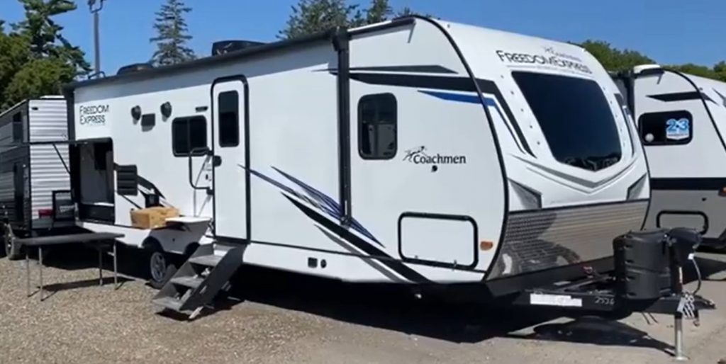 The Coachmen Freedom Express 252RBS is recommended as an excellent option for traveling couples. It has a favorable size, layout, and ease of towing, with wide stance axles for improved stability. The bathroom is spacious, and there is a full-size camp kitchen with a real sink and drain. The private bedroom features a true queen bed with storage underneath.