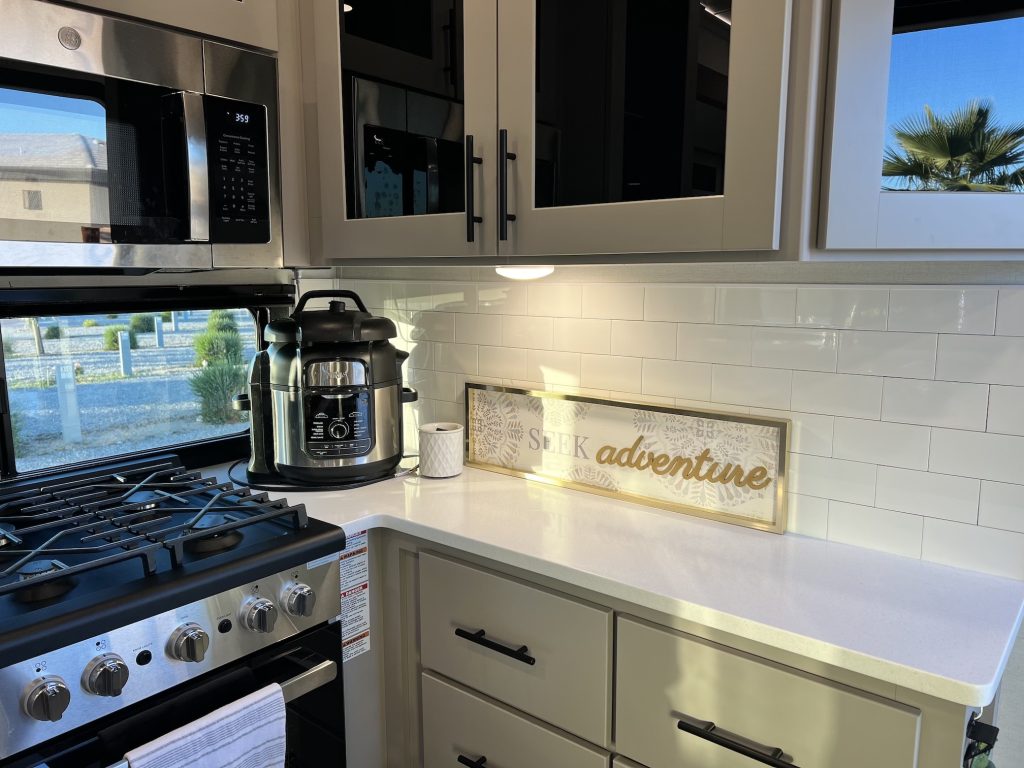 Other things to consider when looking at RV floorplans and layouts are the small, day-to-day details that make a huge difference in how livable the space feels. Countertop space, for example, becomes incredibly important, especially when you’re cooking for a family. Having enough room to prep meals without balancing cutting boards on top of the stove can make cooking in an RV feel much less stressful.