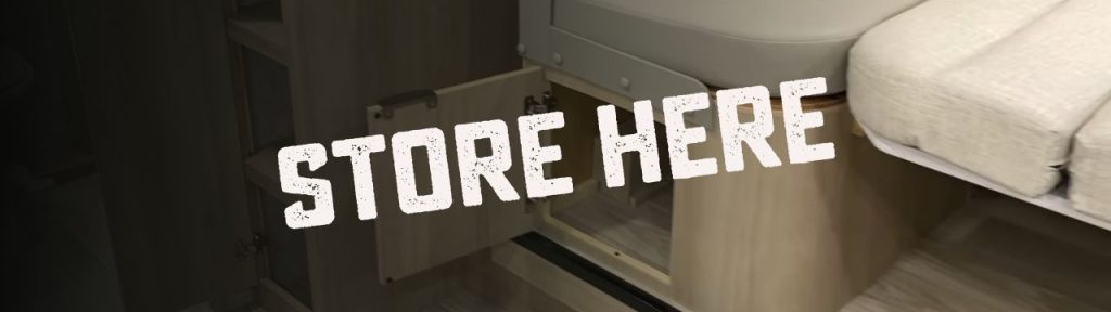 The bedroom offers storage under the bed. The DS and FBS models also provide additional hanging storage. If hanging storage is important to you, keep in mind that the TB version doesn’t include these hanging closet wardrobes in the bedroom.