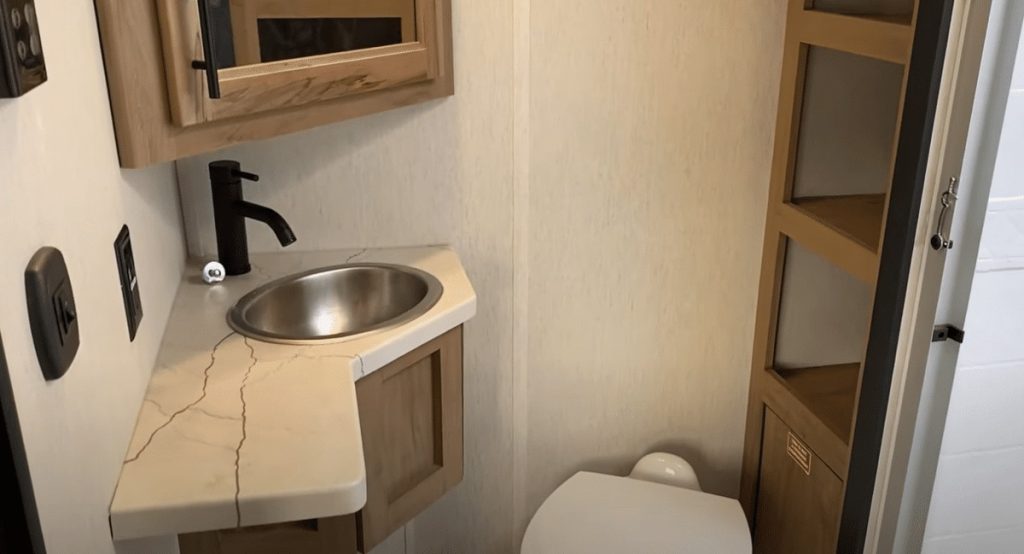 This model introduces a full bed slide, which is something Wolf Pack doesn’t typically do. They included an electric fireplace in the bedroom to help keep you warm in colder temperatures. The closet in the bedroom takes a unique approach with drawers across the top of the closet.