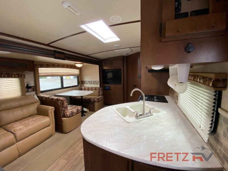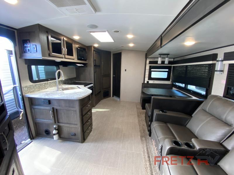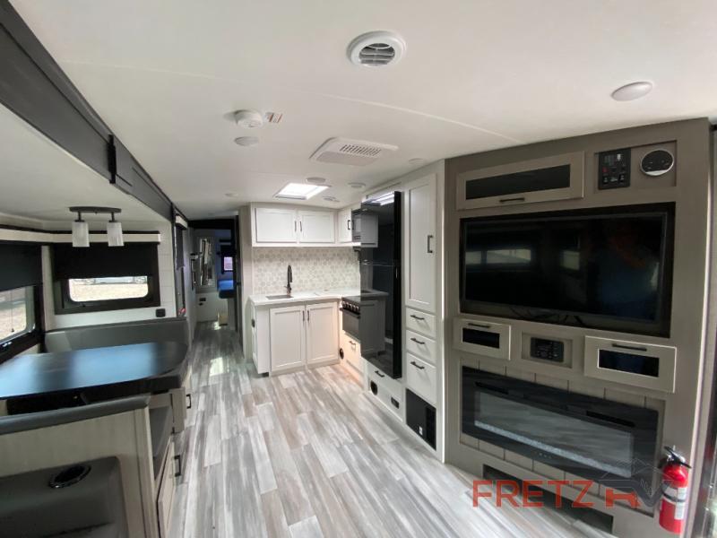 Inside, the White Hawk feels like a true home away from home. On chilly evenings, cozy up by the electric fireplace while you stream your favorite shows on the LED TV. The 10 cu. ft. 12V refrigerator keeps your food fresh for longer trips, and the MaxxAir power roof vent provides refreshing airflow on warmer days.