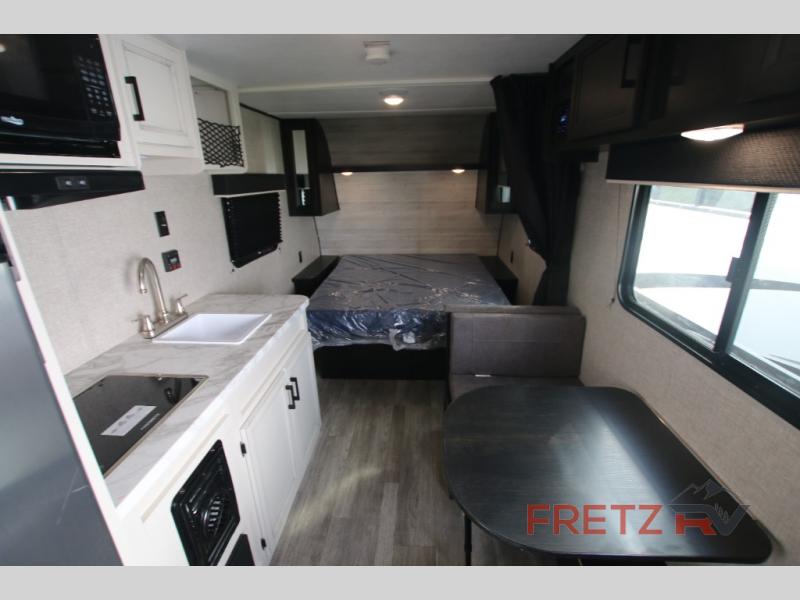 One of the standout features of the Jay Flight SLX 7 195RB is its spacious interior. Despite its compact size, the RV offers a large front bed, a convertible dinette, and a well-appointed kitchen, complete with a two-burner stovetop, a sink, a microwave and a refrigerator. Additionally, the RV is equipped with a full bathroom, including a shower, a toilet, and a sink, making it convenient and comfortable for long trips.