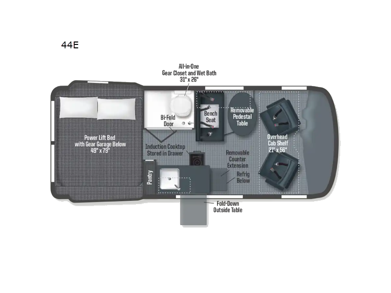 But just because they’re smaller, it doesn’t mean adventure RV vans sacrifice on comfort and amenities. Many models come equipped with features like full kitchens, bathrooms, and comfortable sleeping arrangements, making them perfect for long-term road trips. The Winnebago Revel, for example, features a versatile interior layout with a rear lounge that converts into a comfortable sleeping area, a well-appointed kitchen, and a wet bath.