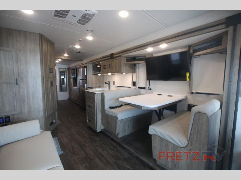 The Winnebago Sunstar is built on a Ford F53 chassis with a powerful V8 engine, providing ample towing power and a smooth driving experience. Automatic hydraulic leveling jacks make setup a breeze, while features like the Winnebago Control™ systems monitor with a 7″ touchscreen monitor keep you connected and in control while on the road. Enjoy the stunning panoramic windshield as you relax inside and take in the views of your journey.