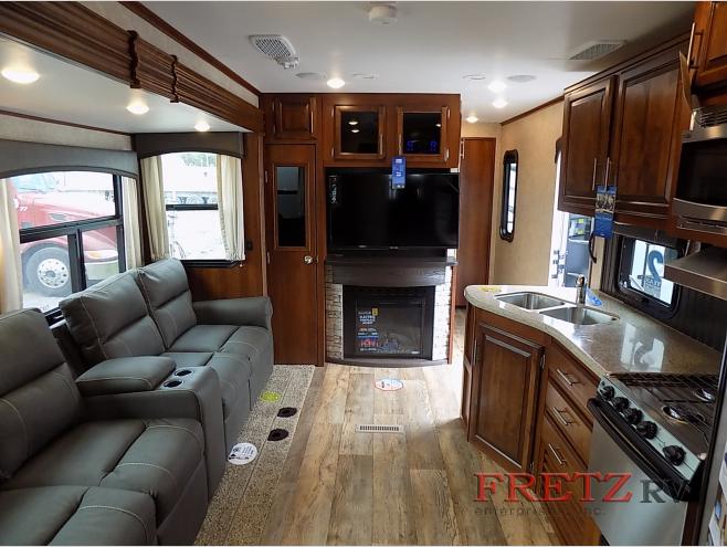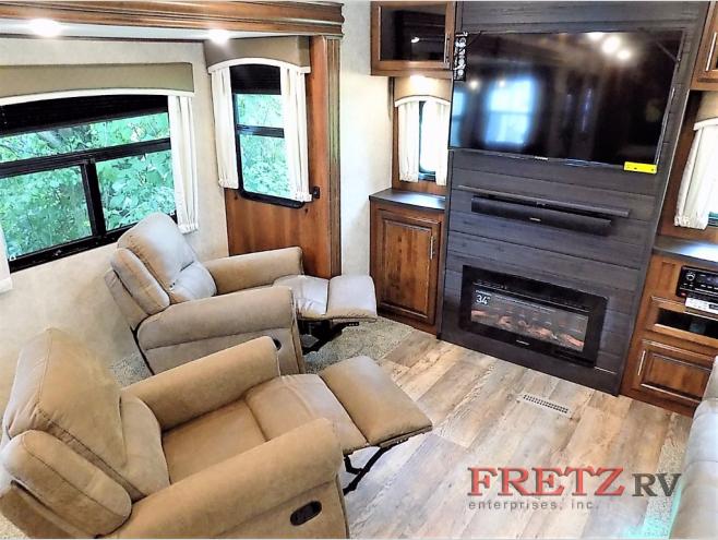 As you step inside the Jayco Eagle Travel Trailer, you are met with a residential ambiance that is warm and welcoming. From the electric LED fireplace to the plush reclining seating to the expansive master bedroom, this cozy camper is an comforting respite after a long day of sightseeing and exploring.