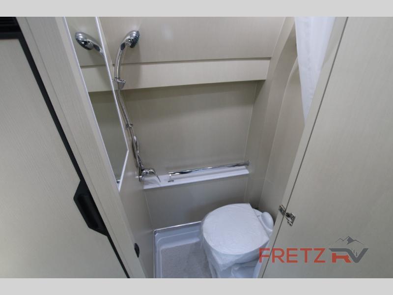 The wet bath in this class B motorhome features a foot-flushing toilet and a handheld shower head. It’s a private space where you can wash away the fatigue from the road and get ready to settle in for the evening. Additionally, you’ll love that there’s a storage nook on the wall for all your toiletries and more.