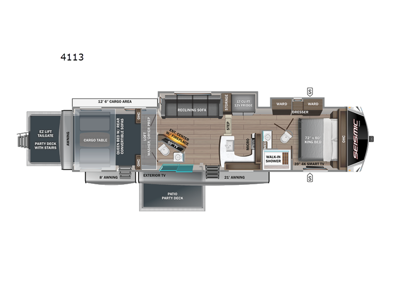 Order this Jayco Seismic Luxury Series 4113 toy hauler fifth wheel from Fretz RV today, and you’ll enjoy a spacious RV with plenty of space for all your outdoor toys. There’s a 12’6″ garage with tie-downs, a loft overhead, and a power ramp door that doubles as a patio when you’re all set up. Additionally, this unit offers three separate awnings for maximum shade at the campground.