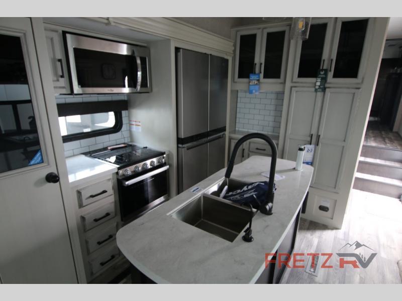 Another excellent option for families or multi-family vacations is the Jayco North Point 377RLBH fifth wheel. This unit provides a similar floorplan with a mid-bunkhouse and a loft overhead. However, this unit offers an outdoor TV hookup so that you can watch your favorite TV shows or sports events without missing a moment.
