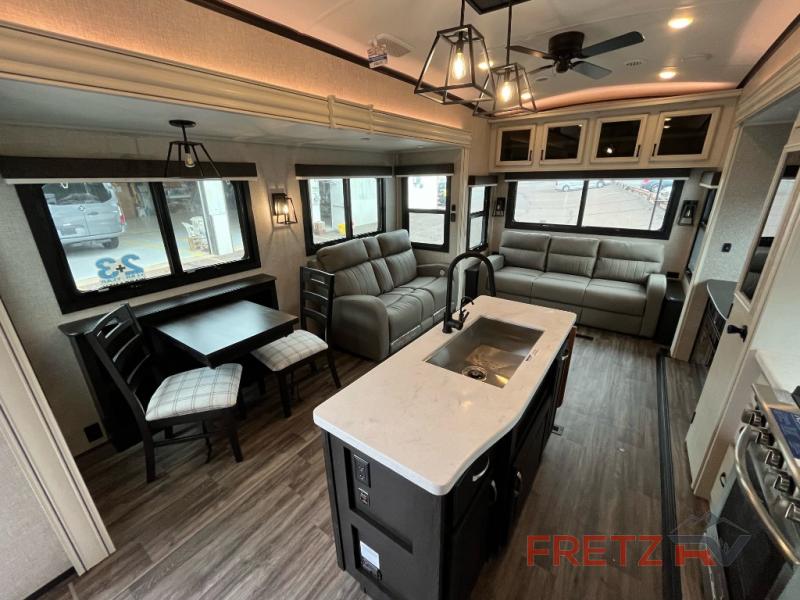There’s sleeping for up to eight inside the Jayco Eagle 355MBQS fifth wheel on sale now at Fretz RV. This unit offers two bedrooms, which makes it ideal for multi-family vacations. You’ll find that the middle bunkhouse has a loft overhead for additional storage and sleeping space. Take one home today.