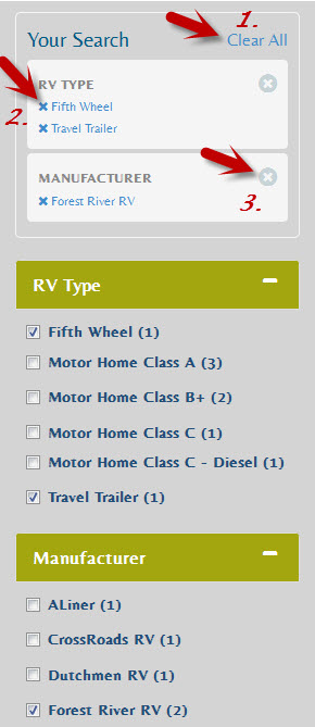 We have added a great new feature to the filtered search control on you website! Your customers’ will now have the ability to quickly view and clear the filters they have selected within the filtered search making it easier for them to find the RV they are looking for.