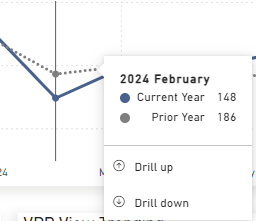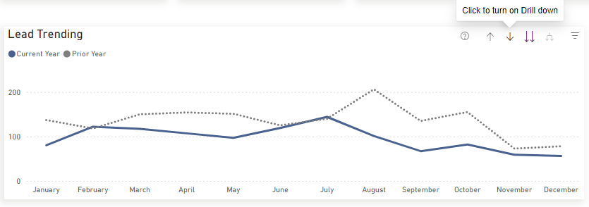 To see day-by-day information for a given month, hover over one of the line charts and click on the ↓ icon. This will activate Drill Mode. Then click on a month on the chart to drill into it. You can click the ↑ icon to return to month-by-month view: